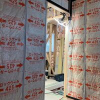 新築中の家です。 新築の家の基礎はほとんどがべた基礎です。 地盤の保証会社もべた基礎を推奨しているようです。 写真の土台と大引が茶色いですがこれは防腐 …