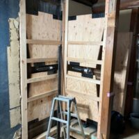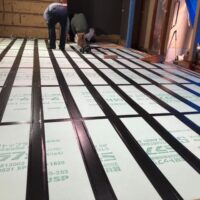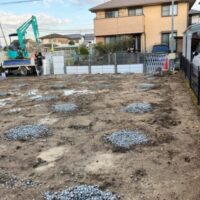 新築中の家です。 新築の家の基礎はほとんどがべた基礎です。 地盤の保証会社もべた基礎を推奨しているようです。 写真の土台と大引が茶色いですがこれは防腐 …