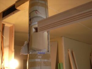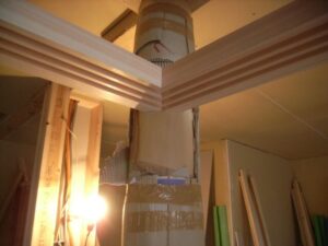 畳コーナーの角柱で3枚引き戸を吊りこむために鴨居を取り付けて