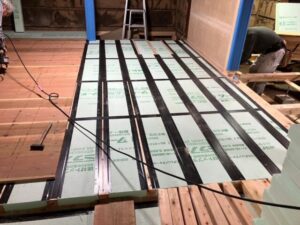現場では写真にある断熱材、気密を確保するための気密テープ